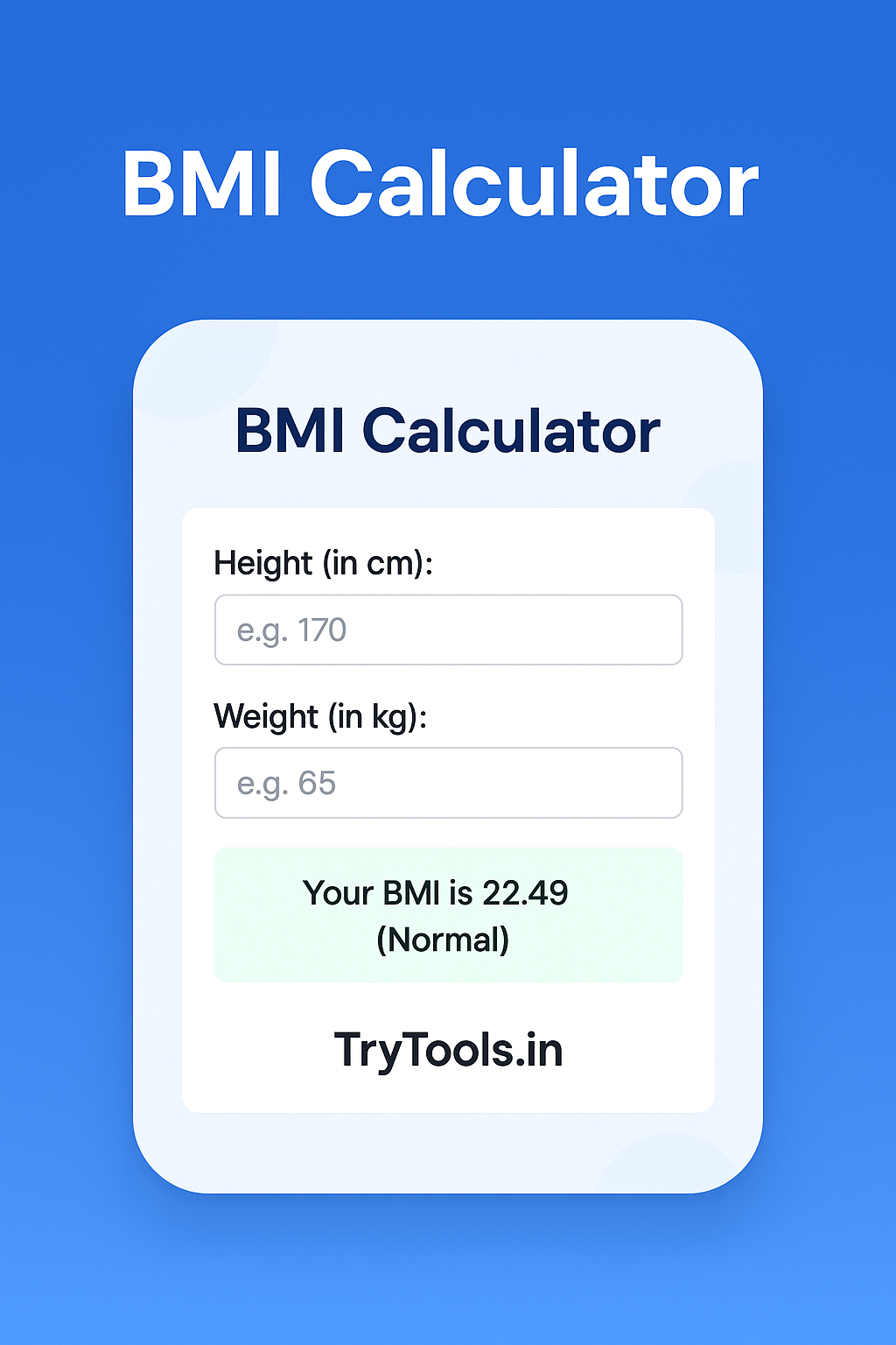 Use this free and fast BMI Calculator by TryTools.in to know whether you are underweight, normal, overweight, or obese based on your height and weight.